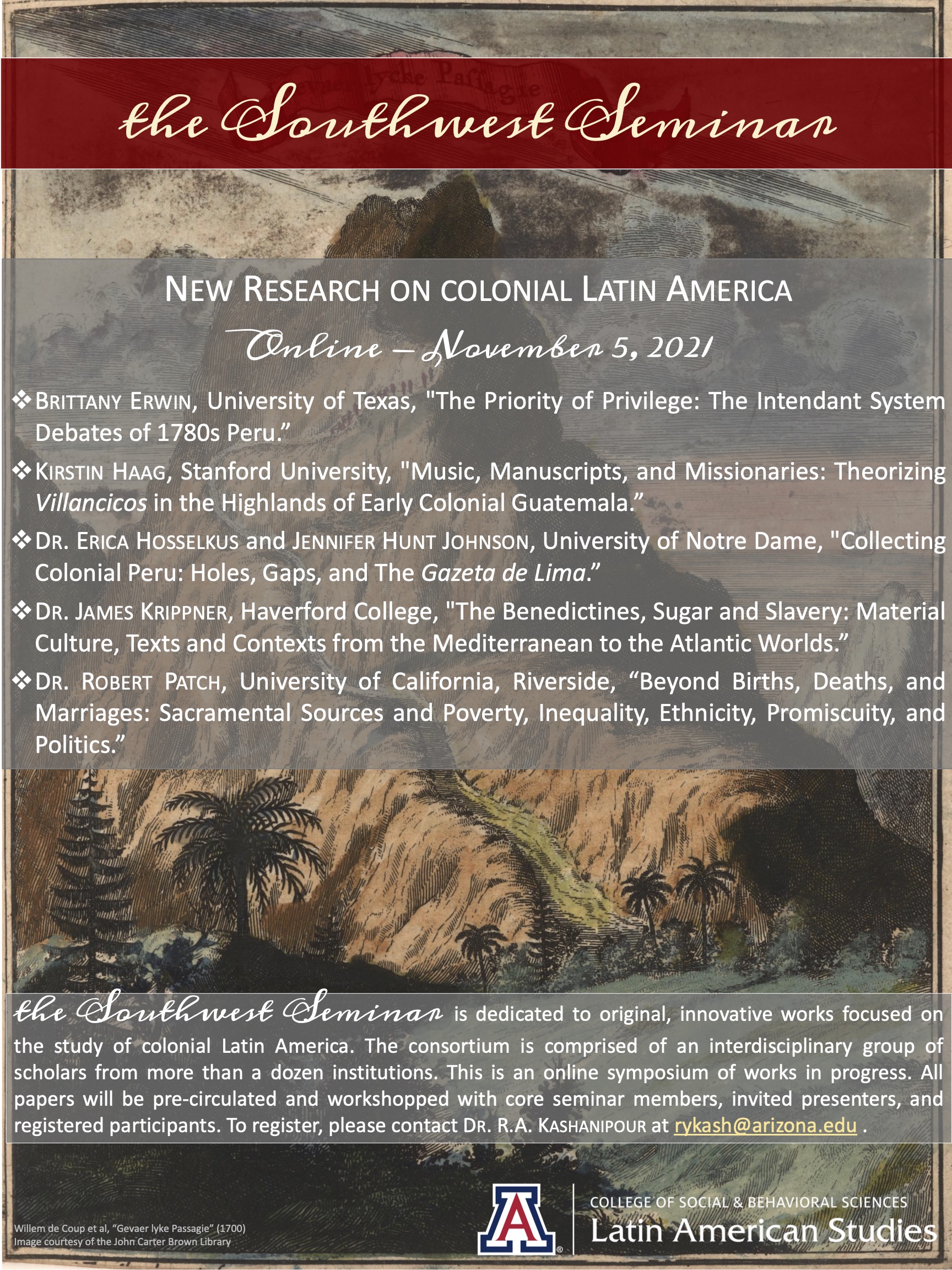 The Southwest Seminar is currently hosted by the Center for Latin American Studies at the University of Arizona as a consortium supported by the Omohundro Institute for Early American History and Culture, Texas Christian University, Texas State University, University of Arizona, University of California-San Diego, University of Texas-El Paso, University of Texas, San Antonio, and Utah Valley University. The Seminar works in coordination with Routledge Press and invites participants to contribute individual or collaborative works for the New Colonial Histories of Latin America book series.