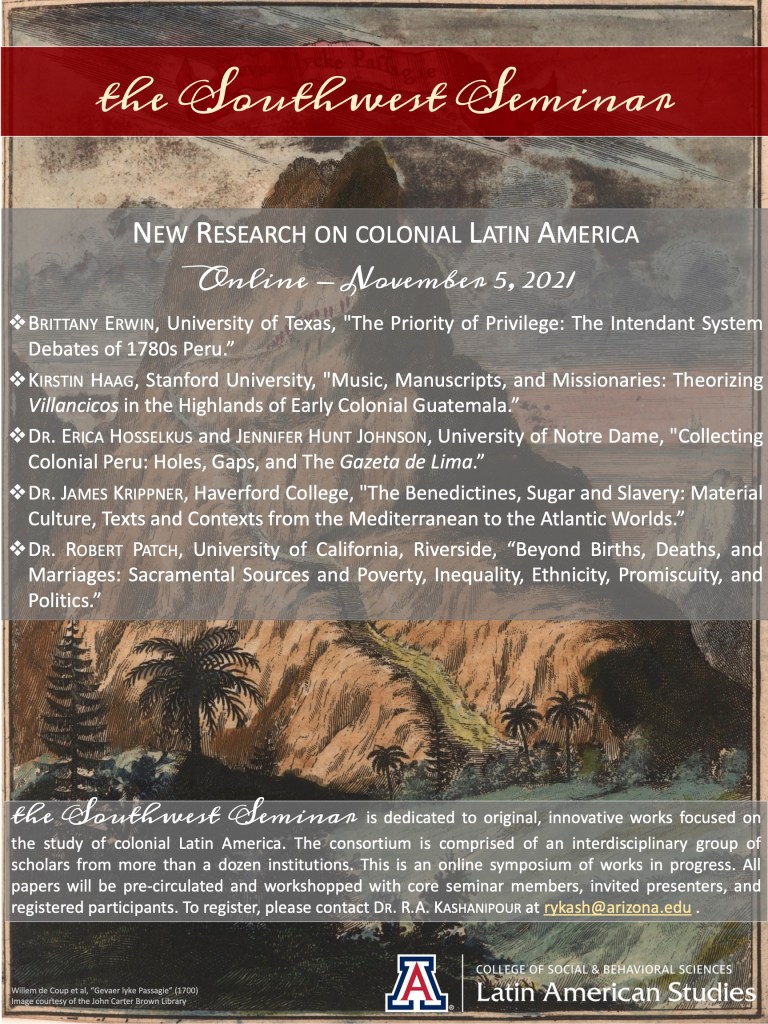 The Southwest Seminar on Colonial Latin America invites proposals for the annual meeting in autumn 2021. The Southwest Seminar is a collaborative effort among specialists from across the American Southwest dedicated to promoting innovative and interdisciplinary approaches to the study of colonial Latin America. Past participants have included renowned historians, art historians, literary scholars, and specialists in language and literature. This year, we invite scholars interested in conceptualizing colonial archives, both in theory and practice. We are particularly interested in works that take new approaches to the archive in terms of method and findings, as well as those that examine existing practices and shape understandings of the colonial period. We welcome works that work to foster greater engagement with archives as historically constructed institutions and as repositories for material and intellectual engagement. While we encourage submissions on this theme, proposals on other topics in colonial Latin America will be given full consideration. In lieu of the traditional in-person seminar hosted in-person at a site in the American Southwest, this year’s virtual meetings will be hosted by the Center for Latin American Studies at the University of Arizona. Seminar participants will share works in progress related to the study of colonial Latin America and meet virtually for group dialogue and discussion.